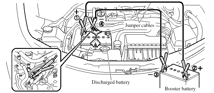 - Connect the other end to the ground point indicated in the illustration away from the discharged battery (4).