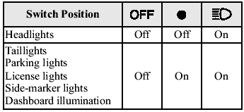 Turn the headlight switch to turn the headlights, other exterior lights and dashboard illumination on or off.